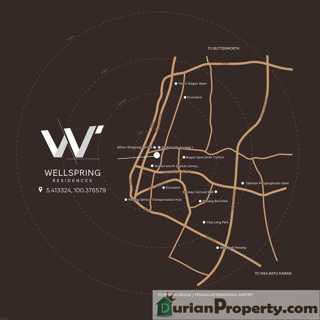 Wellspring Residences is near to amenities such as shopping malls(Billion Shopping Centre Butterworth, Sunway Carnival Mall, Aeon Big Seberang Jaya, Lotus's Bagan Ajam(Tesco), Econsave, Megamall Penang), transportation hub (Penang Sentral Transportation Hub), and schools (Ams Academy, SRJK(C)Chung Hwa 1, Butterworth Digital Library, SK St. Mark Butterworth, SK Bagan Tuan Kechil, SK Sungai Nyior, SJK(T)Perai, SMK Seberang Jaya, SK Taman Inderawasih, SK Convent Butterworth, SMK Tun Hussein Onn), healthcare facilities(Bagan Specialist Centre, Hospital Seberang Jaya), tourist attractions(Nine Emperor God Temple, Beihai Doumu Palace, Butterworth Art Walk, Penang Bird Park, Pantai Bersih, Dataran Permuda Merdeka, Sree Maha Mariamman Devasthanam Temple).